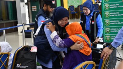Embarkasi Palembang menerima kedatangan 370 jemaah haji Kloter 12 asal Kabupaten Ogan Komering Ilir (OKI) dan Palembang, Jumat (16/05/2025). Kloter 12 ini akan diberangkatkan besok pagi dari Bandara Internasional Sultan Mahmud Badaruddin (SMB) II Palembang menuju Bandara King Abdul Aziz, Jeddah.