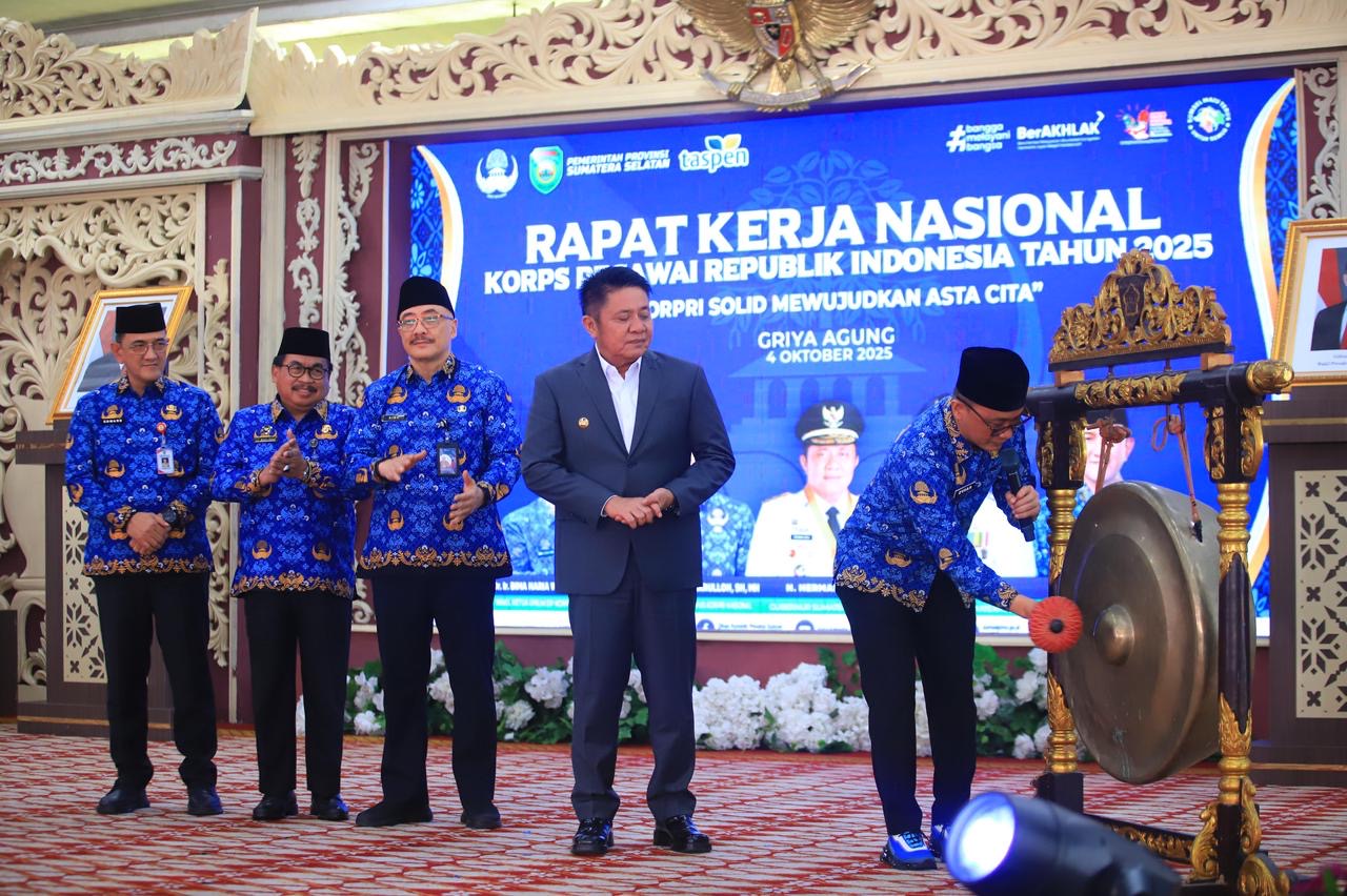 PALEMBANG — Gubernur Sumatera Selatan (Sumsel) Herman Deru menyambut dengan penuh sukacita pelaksanaan Rapat Kerja Nasional (Rakernas) KORPRI tahun 2025 yang digelar di Kota Palembang.