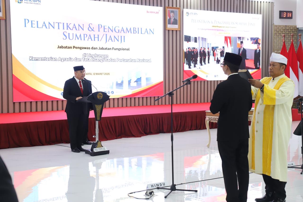 Jakarta – Kementerian Agraria dan Tata Ruang/Badan Pertanahan Nasional (ATR/BPN) menggelar Pelantikan dan Pengambilan Sumpah/Janji Jabatan Pengawas dan Jabatan Fungsional, di Aula Prona Kementerian ATR/BPN, Jakarta pada Kamis (12/03/2026).